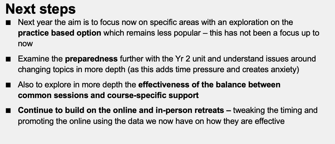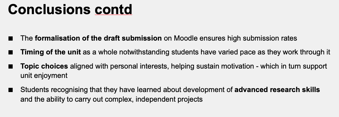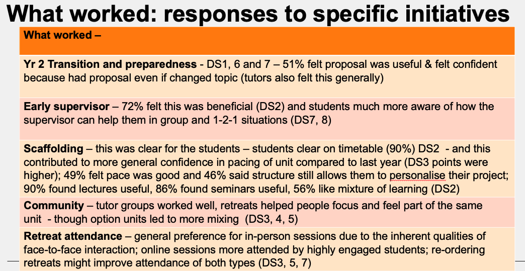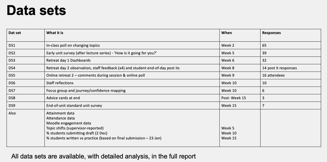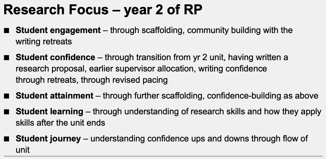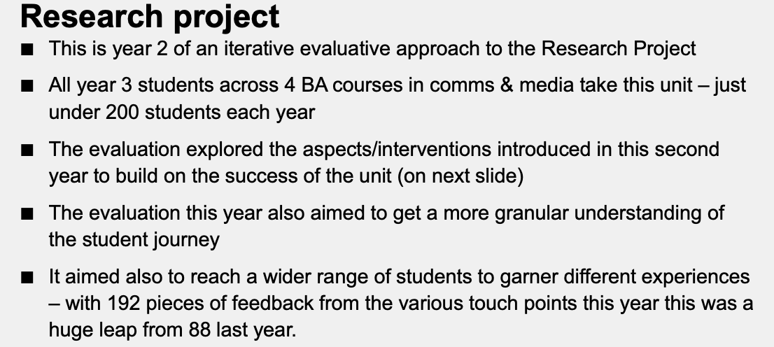 This evaluative project is in its second year. Based on the next steps that emerged from last year’s evaluation, this second iterative evaluation explored the effectiveness of those initiatives. It was also able to cross-compare data sets with last year’s sets while introducing further research opportunities. This year the evaluation reached almost double the students compared to last year with a wider range of responses in different formats throughout the unit.