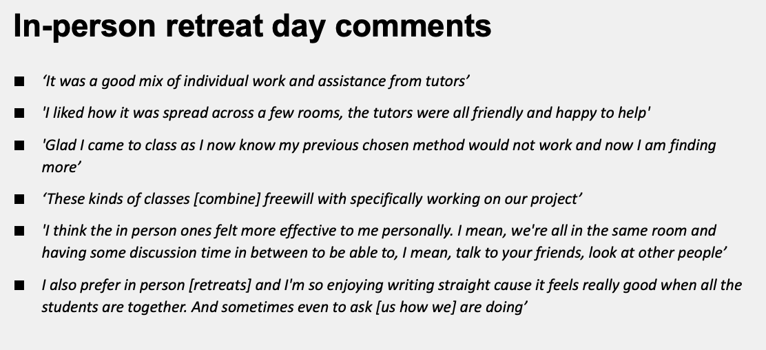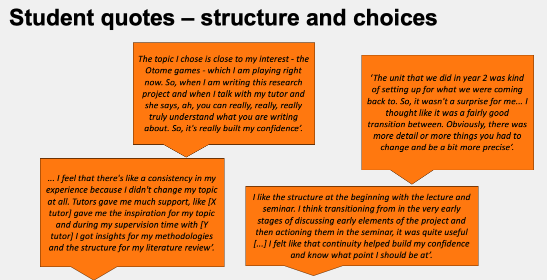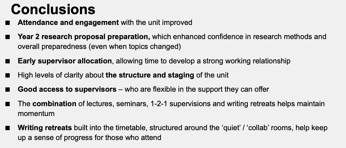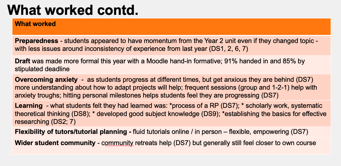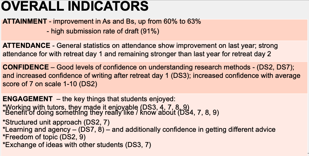 This evaluative project is in its second year. Based on the next steps that emerged from last year’s evaluation, this second iterative evaluation explored the effectiveness of those initiatives. It was also able to cross-compare data sets with last year’s sets while introducing further research opportunities. This year the evaluation reached almost double the students compared to last year with a wider range of responses in different formats throughout the unit.